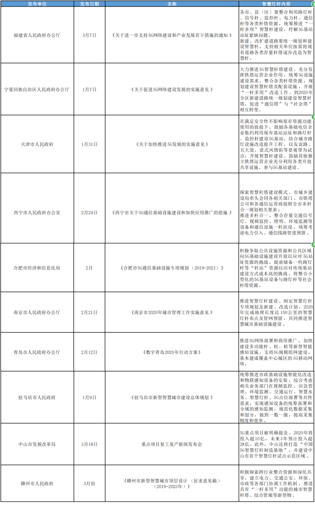 據(jù)不完全統(tǒng)計,截至4月1日,2020年我國已有福建、寧夏、西寧、合肥、青島等多地政府部門已出臺相關(guān)政策推動智慧燈桿建設(shè)。